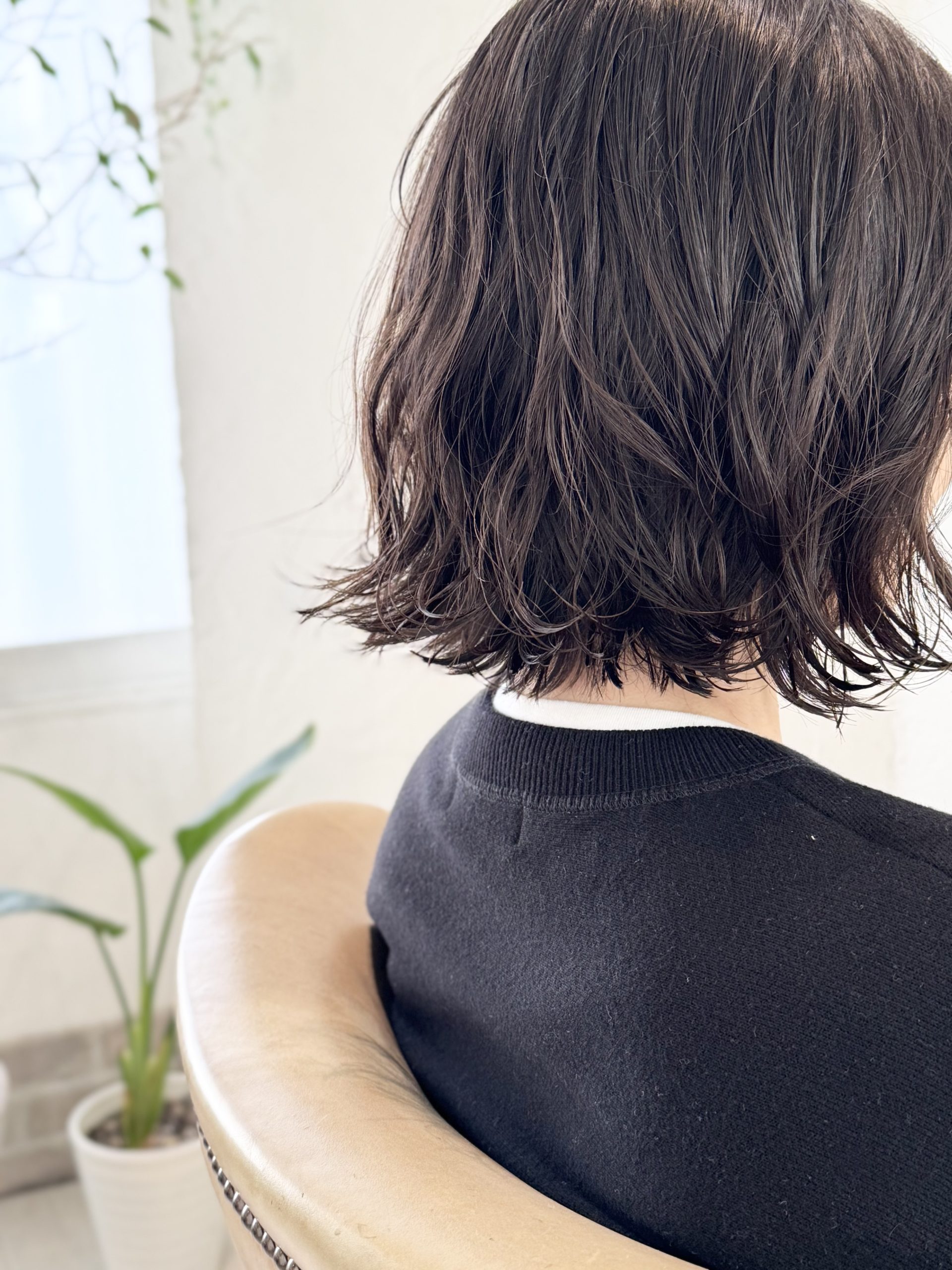 スタイルメニュー カット+パーマ スタイリストコメント hair/北崎麻美 切りっぱなしのボブスタイルに 中間から毛先にかけて緩いパーマをオン。 仕上げはセラム(美容液)をつけて しっとり感を。 春に向けて動きのあるスタイルを◎